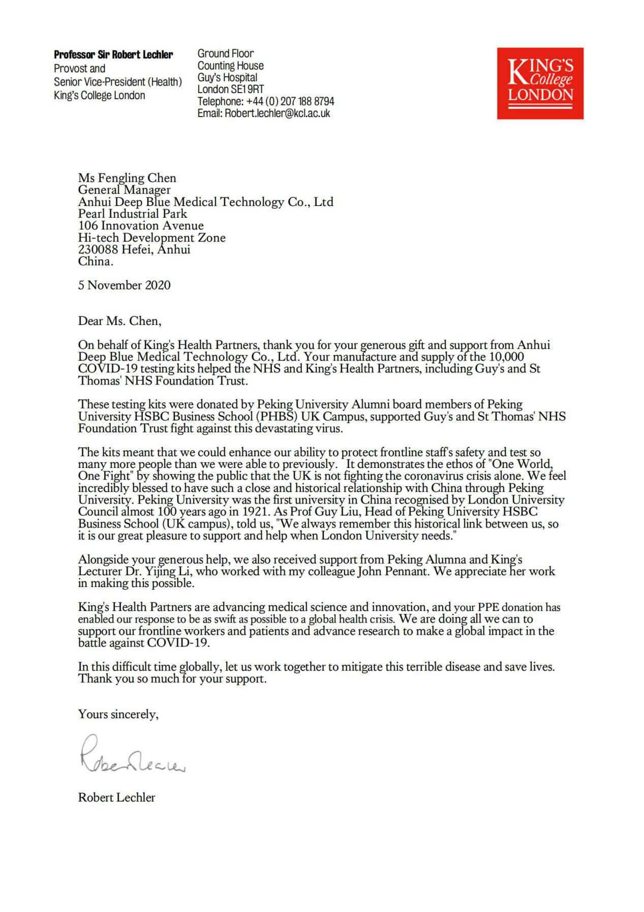 今年3月,深藍(lán)醫(yī)療通過(guò)北京大學(xué)匯豐商學(xué)院向倫敦國(guó)王學(xué)院捐贈(zèng)了10000個(gè)SARS-CoV-2(IgG/IgM)抗體檢測(cè)試劑盒,并收到了英國(guó)國(guó)王學(xué)院高級(jí)副校長(zhǎng) Mr. Robert Lechler的感謝信,信中說(shuō):“One World, One Fight”。深藍(lán)醫(yī)療為與英國(guó)攜手并肩,共抗疫情而驕傲,更為收到Mr. Robert Lechler的不遠(yuǎn)萬(wàn)里發(fā)來(lái)的感謝信而自豪。
