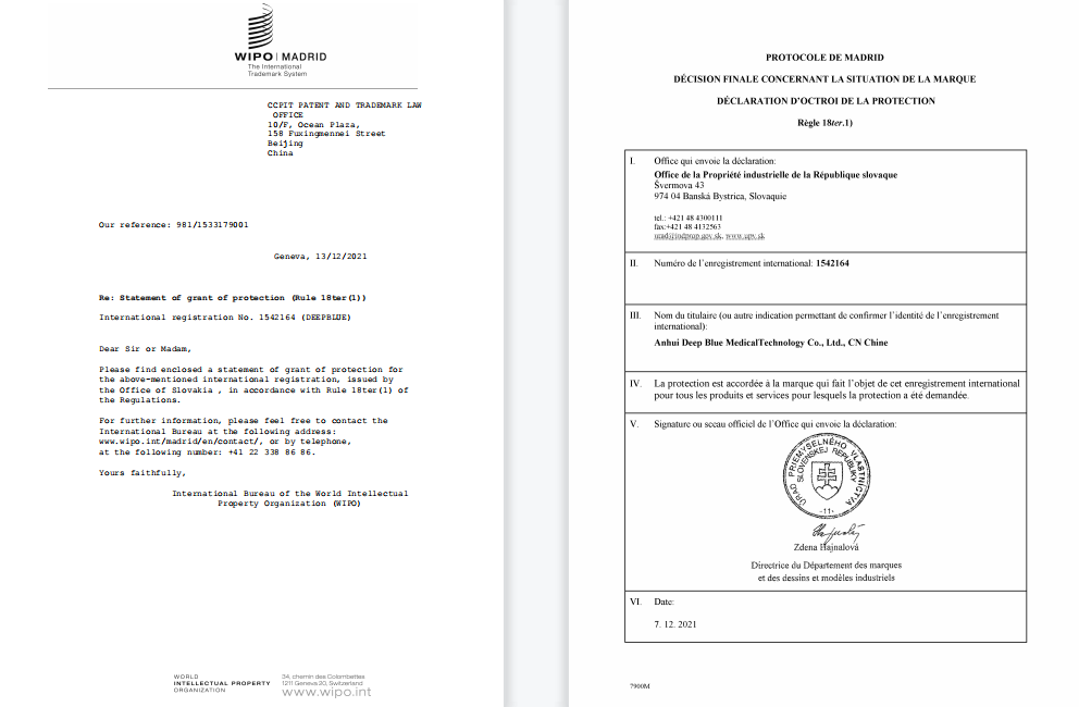 多年來,公司不斷開拓國際市場,產(chǎn)品出口國家和地區(qū)不斷增加,為進一步保護公司在海外市場的權益,不斷擴大品牌影響力和市場份額。2020年深藍通過馬德里商標體系開展了各個國家商標保護,并陸續(xù)獲得核準保護。12月15日,DEEPBLUE取得斯洛伐克國家的核準保護通知。