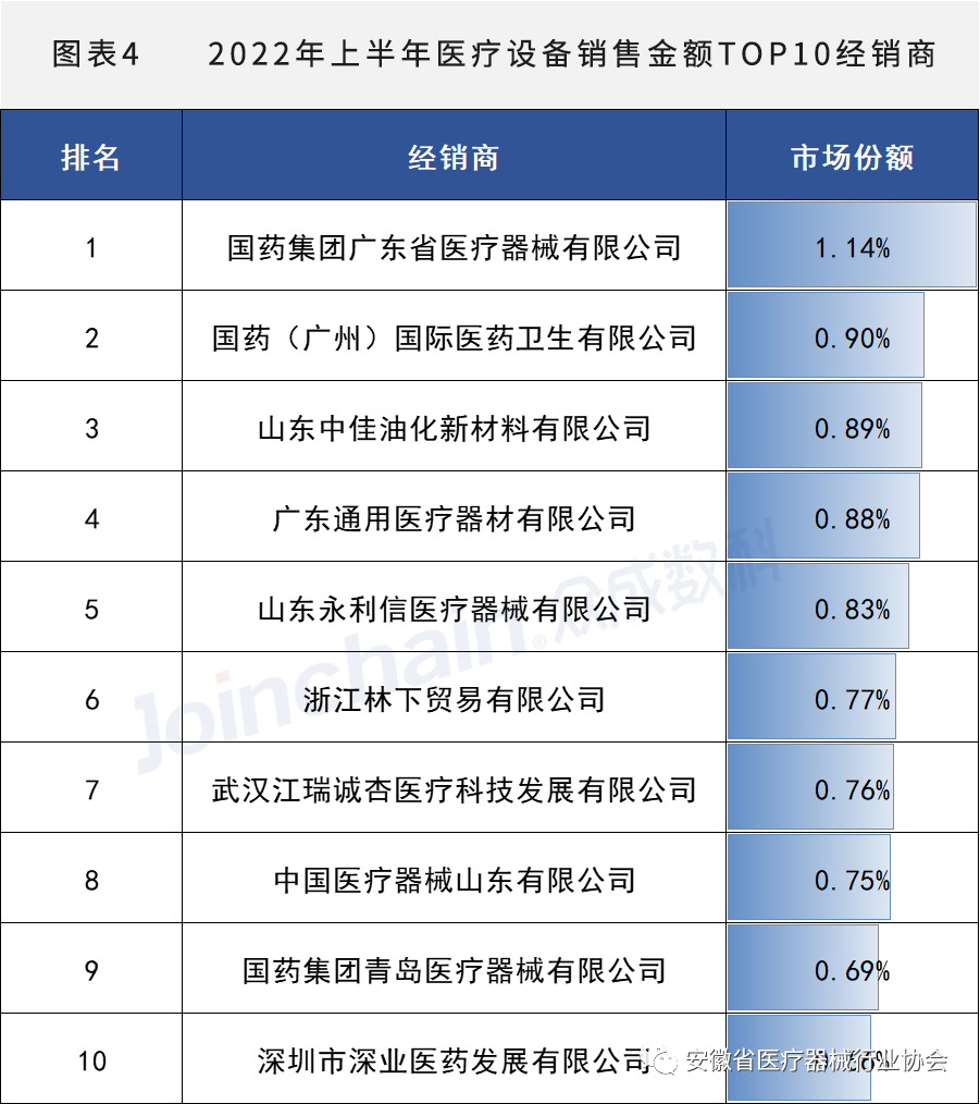 根據中標結果,2022年上半年醫療器械設備總銷售額排名第一的是國藥集團廣東省醫療器械有限公司,國藥(廣州)國際醫藥衛生有限公司、山東中佳油化新材料有限公司分別位列第二、第三。