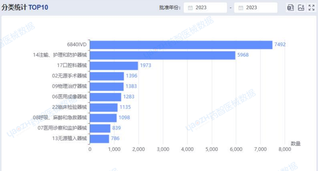 從產品類別來看,2023年全國注冊醫療器械產品中,體外診斷試劑(7492件),注輸、護理和防護器械(5968件)及口腔科器械(1973件)注冊數量位列前三。