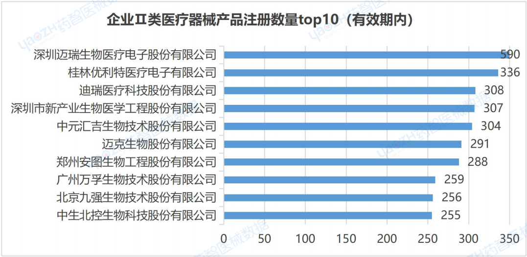 從企業注冊數量來看,截至2024年2月,在有效期內全國共有19234家企業注冊Ⅱ類醫療器械產品,注冊數量排名第一的企業是深圳邁瑞生物醫療電子股份有限公司,產品注冊數為590件。