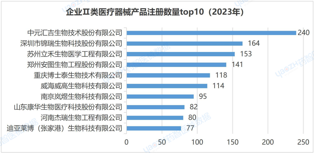 其中,2023年全國共有7073家企業注冊Ⅱ類醫療器械產品,注冊數量排名第一的企業是中元匯吉生物技術股份有限公司,產品注冊數為240件。