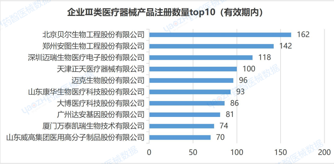從企業注冊數量來看,截至2024年2月,在有效期內全國共有3048家企業注冊Ⅲ類醫療器械產品,注冊數量排名第一的企業是北京貝爾生物工程股份有限公司,產品注冊數為162件。