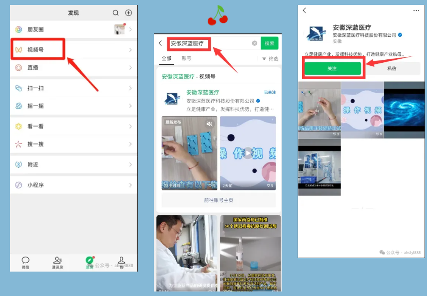 2、打開(kāi)微信,點(diǎn)擊“發(fā)現(xiàn)”中的視頻號(hào),在微信視頻號(hào)搜索框,搜索“安徽深藍(lán)醫(yī)療”后,即可關(guān)注相應(yīng)的視頻號(hào)。