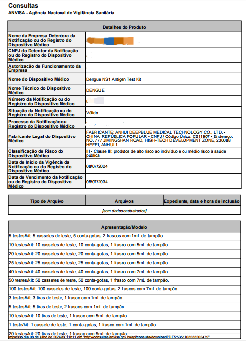 在全球化浪潮的推動下,安徽深藍醫療科技股份有限公司(以下簡稱“深藍醫療”)于近期迎來了一個重要的里程碑——深藍醫療的登革熱NS1抗原檢測試劑盒(Dengue NS1 Antigen Test Kit)成功通過巴西的ANVISA(Agência Nacional de Vigilancia Sanitária,巴西國家衛生監督局)注冊!這是繼登革熱NS1抗原檢測試劑盒獲得英國、阿根廷、德國、泰國、馬來西亞等多個國家衛生部的權威認證后的又一重大利好消息。